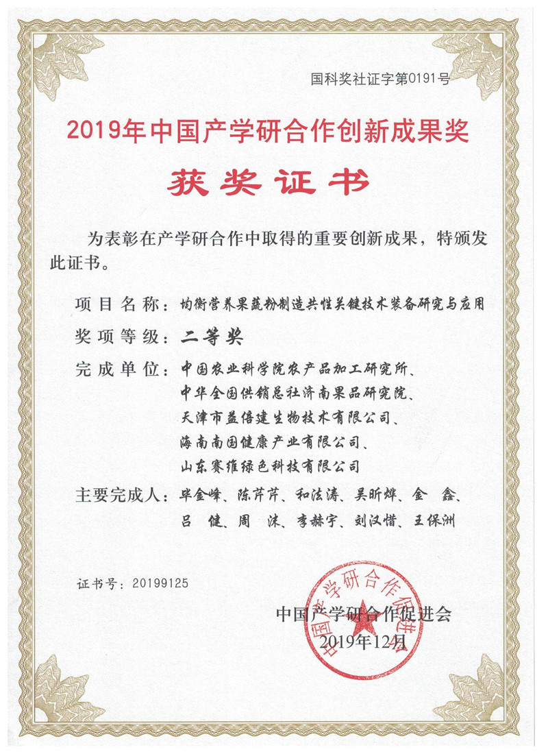 益倍生物科研团队同中国农业科学院农产品加工研究所,中华全国供销总社济南果品研究所等单位共同合作,凭着在产学研合作、成果转化等方面的突出贡献,以“均衡营养果蔬粉制造共性关键技术装备研究与应用”项目获得“2019年中国产学研合作创新成果奖”二等奖。