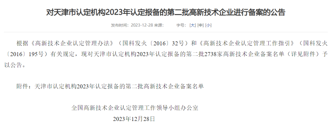 12月28日,高新技术企业认定管理工作网发布了《对天津市认定机构2023年认定报备的第二批高新技术企业进行备案的公告》。 ...